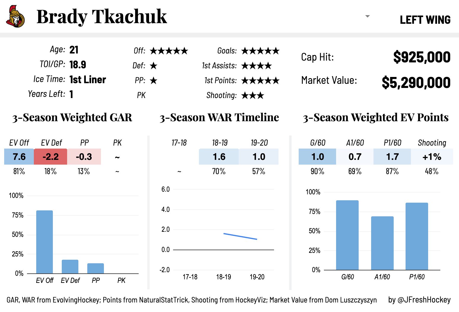 Brady Tkachuk currently plays for the Ottawa Senators NHL. The disparity between his expected goals and his actual goals is absolutely huge. 4 pick in the 2018.